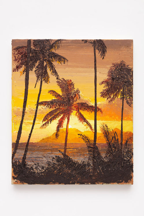Amarela - cinco pinturas de pôr do sol em praias com palmeiras remetendo ao Nordeste brasileiro. "Luz do sol" 330x148cm, "Graça" 120x80 cm, "Glória da vida" 60x50cm, "Força" 70x60cm e "Coisa mais querida" 50x60.